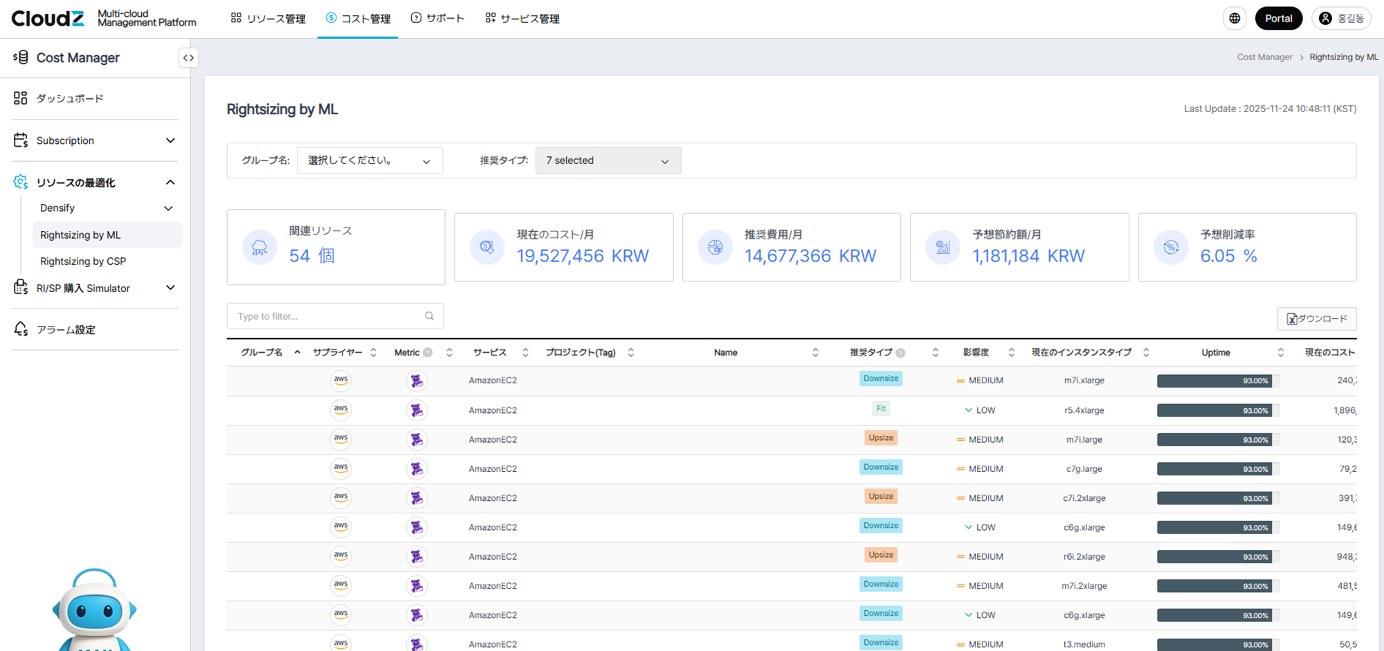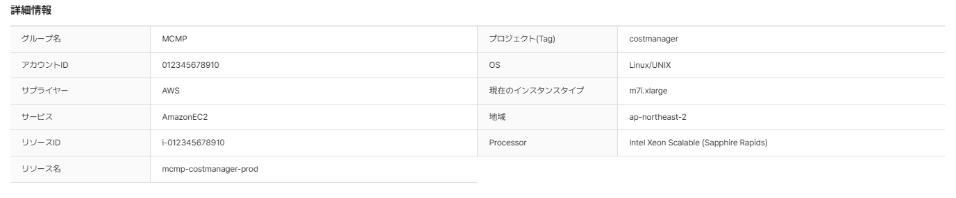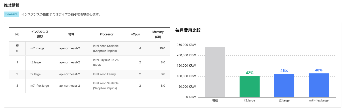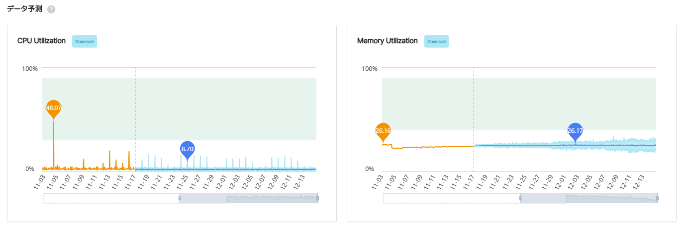 サーバーの CPU およびメモリ使用量を分析し、今後 1 ヶ月間の利用量を予測し、その結果に基づいて適切なインスタンスタイプの推奨を受けることができます。