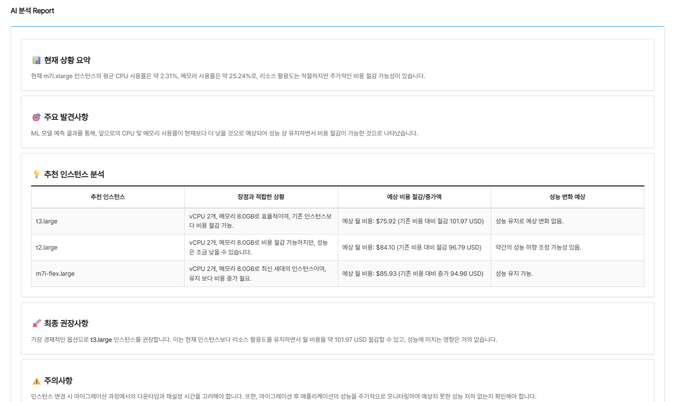 サーバーの予測結果および推奨データを AI に渡し、一般ユーザーにも理解しやすい自然言語レポートを生成します。